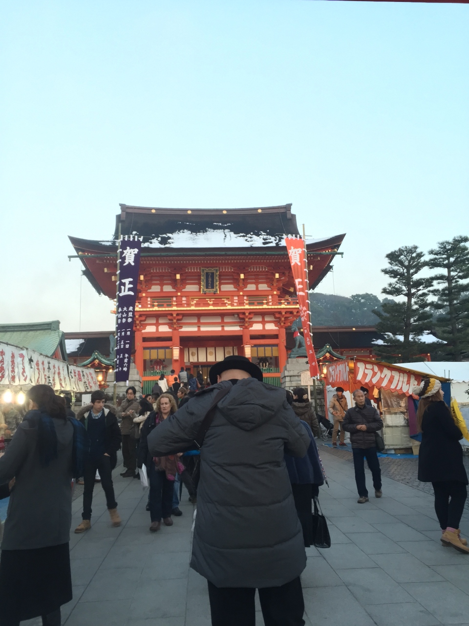 新年早々伏見稲荷へお詣りに来ました。楼門前に掲げられている旗も賀正使用です。屋台がいっぱいでているかな?と思っていたけど、そこは割と普段通り?楼門の上にはうっすら雪が積もっていて、京都は雪が降るんだなあと実感。楼門前に来たら、やはり狐さんの写真を撮ります。