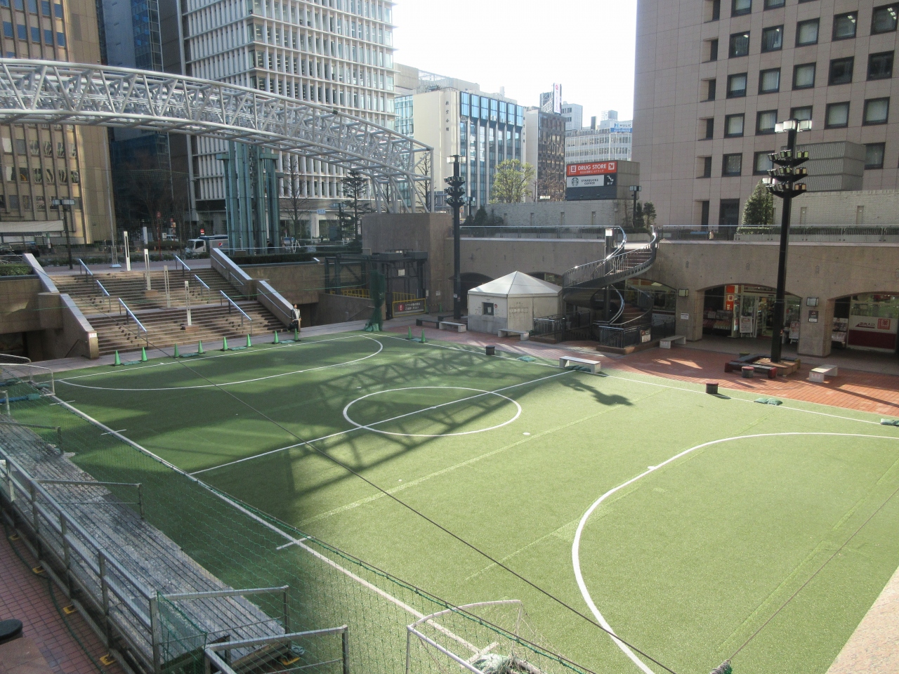 日比谷国際ビル前の地下1階にフットサルコートが一面造られています。周囲はネットに囲まれ、観客席も造られ、ナイター設備も整った本格的なコートです。都心の高層ビルに囲まれた一角になぜフットサルコートが造られているのか、だれが利用するのか疑問だらけですが、都心の真ん中にフットサルコートを造った発想は素晴らしいと思います。実際にプレーをしている様子を見てみたいです。
