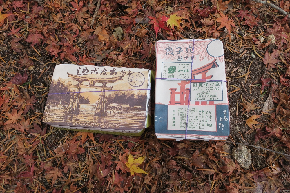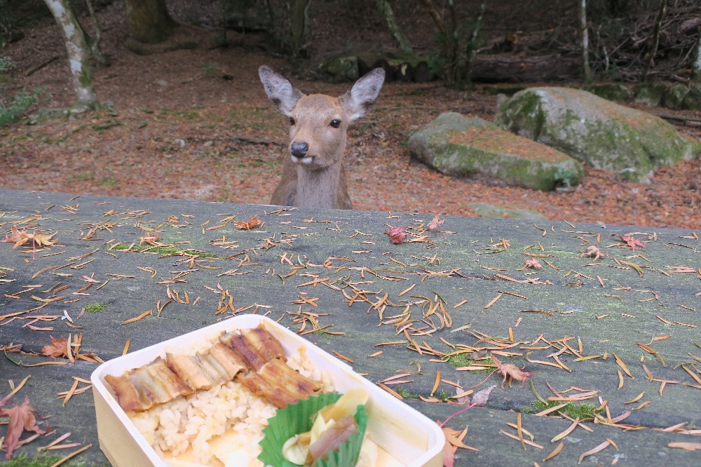 紅葉シーズンに宮島に渡って食べようとお弁当を予約しました。前々日くらいに電話したら、希望の時間は一杯だけど、少し待ってもらえれば渡せるとのことで、予約完了。当日は店内食を予約する人とお弁当を買う人が同じ列で20人以上は並んでいましたが、予約してある旨を伝えると、列とは関係なくすぐに渡してもらえました。温かい穴子丼もいいけれど、実は作ってしばらく経ったお弁当のほうが、穴子の汁がご飯に沁みて美味しいとは、店のHPの受け売りです。確かに昔ながらの経木の折りに入った穴子弁当を鹿にのぞかれながら食べた味は忘れられない思い出になりました。