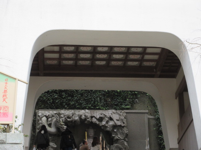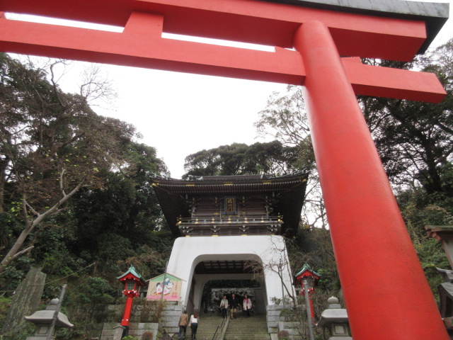 藤沢の江の島の観光で江島神社を訪問しました。その神社の参道を通り入口の赤い鳥居を抜けたところ、正面にある白い門がこの門です。竜宮城の入り口っぽい雰囲気で、とても目立ちます。天井には牡丹とか獅子の絵も描いてあって豪華な門でした。