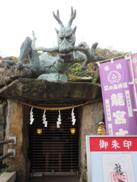 江ノ島の観光で江島神社を参拝しました。その神社の境内にある建物です。読みは「りゅぐう」ではなく「わだつのみや」と読むそうです。大きな龍ののった建物で、とても迫力がありました。昔から江の島は龍が住むといわれていたそうです。