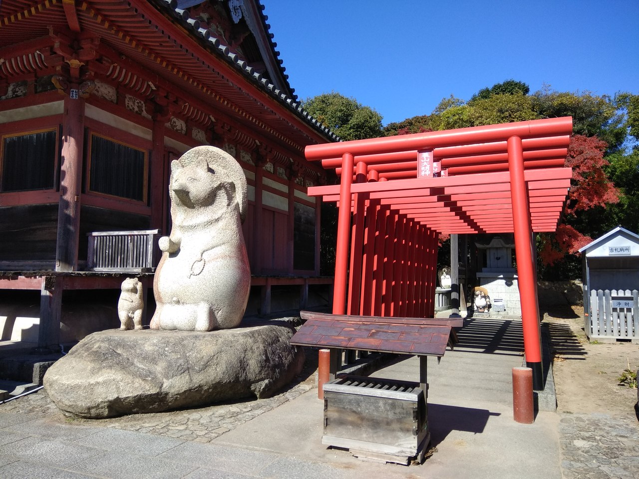 屋島展望所の駐車場から徒歩数分です。大きなお寺ではありませんが、境内に赤い鳥居がいくつも重なっているところが印象的で、プチ宮島を連想させました。