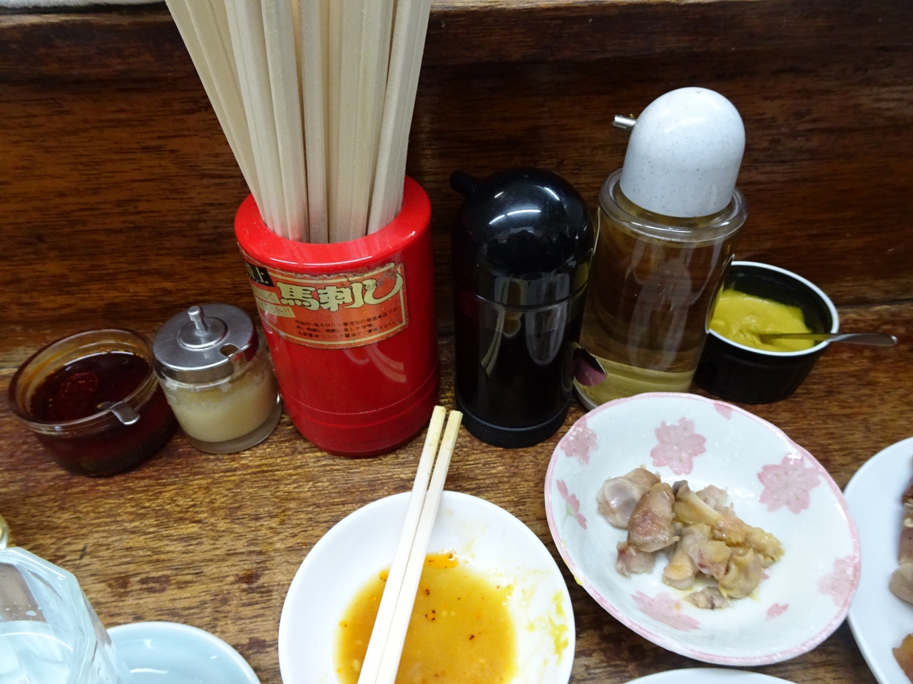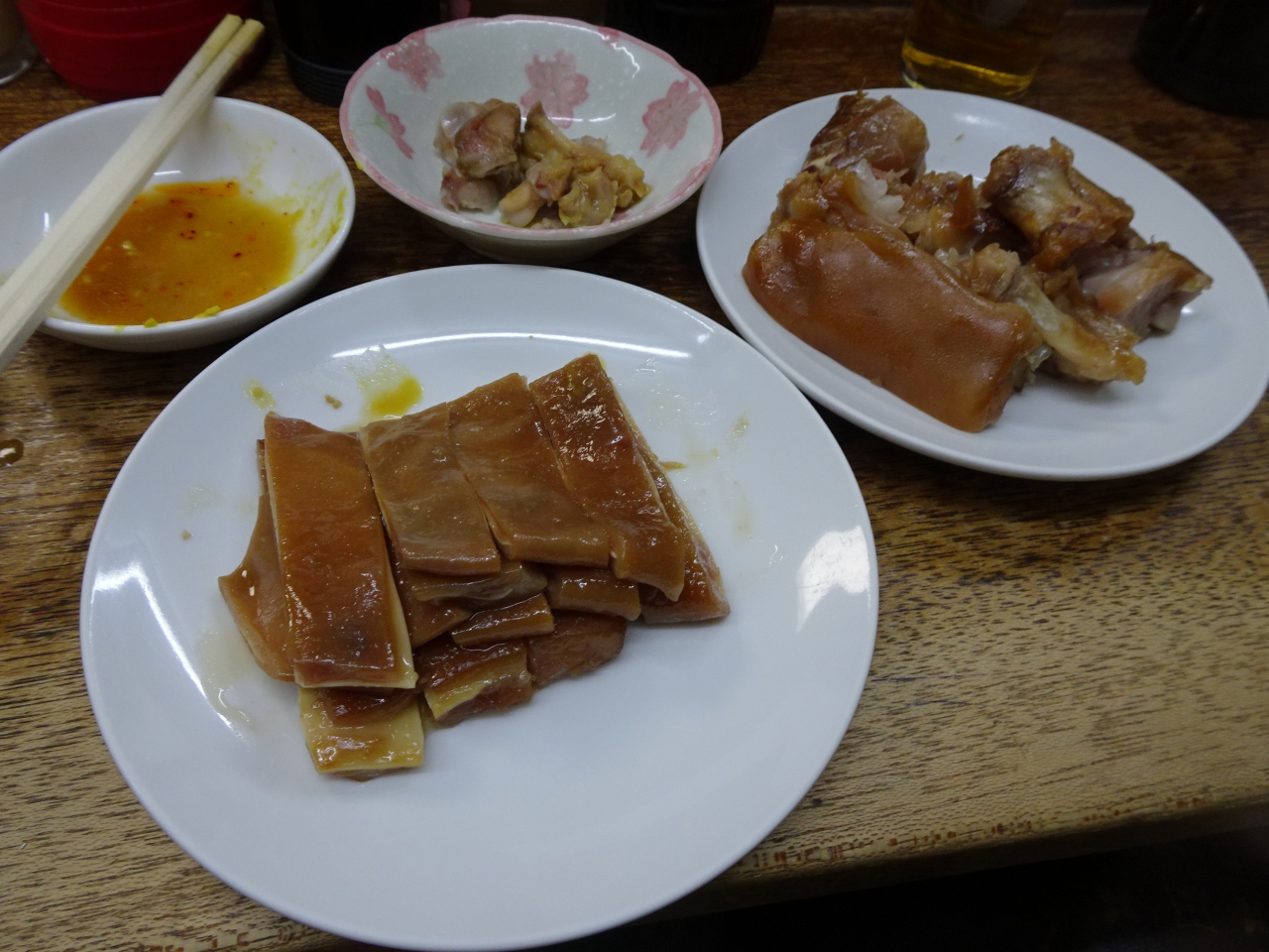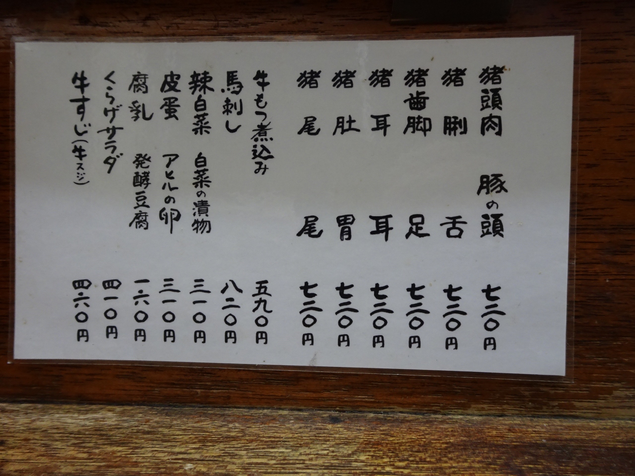 横浜駅西口から近くの狸小路にあります。1階と2階がありますが、2階がメインです。急な階段を上って(「登って」が正しいでしょうか。)2階にいくと厨房を囲むカウンター席とわずかなテーブル席があります。メニューは、豚のモツ(足、耳、尻尾、頭、舌、胃等)があり、腐乳、ラッパ菜等もあります。飲み物はビールやサワー類もありますが、独特な形状の「やかん」と呼ばれる入れ物に入った25度の焼酎を飲んでいる人が多いです。