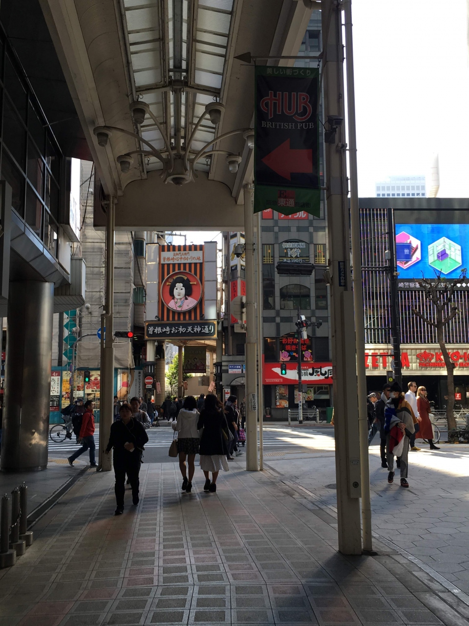 飲食店がずらりと並ぶ曽根崎お初天神通り商店街。お初天神を中心になかなかの規模の商店街です。夜に開くお店が多いのは阪急東通り商店街とよくにています。入り口の看板が実に迫力があって外国人観光客がよく撮影をしています。
