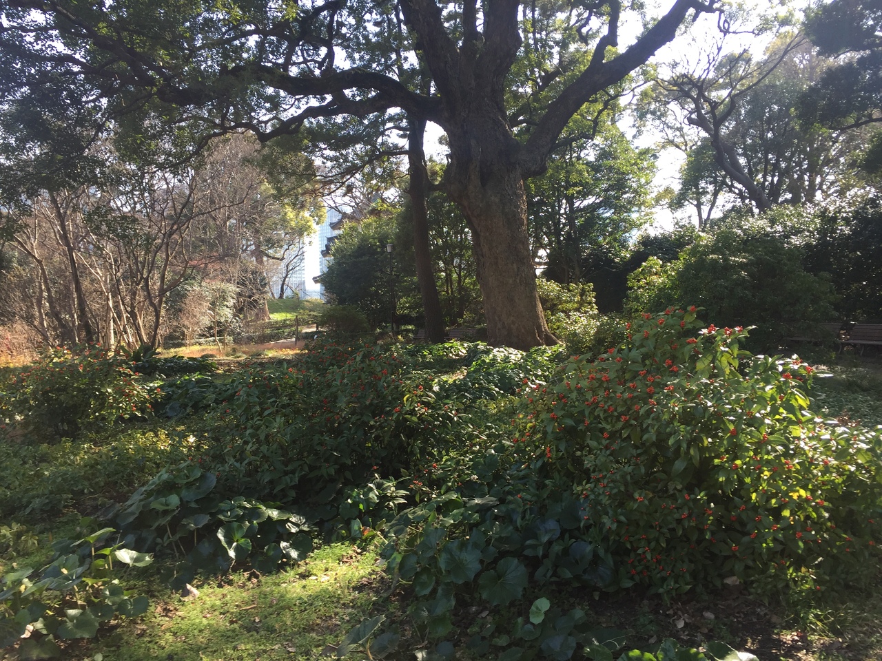 赤い実の常緑樹はいろいろあり 冬に新年らしい彩を添えていた。