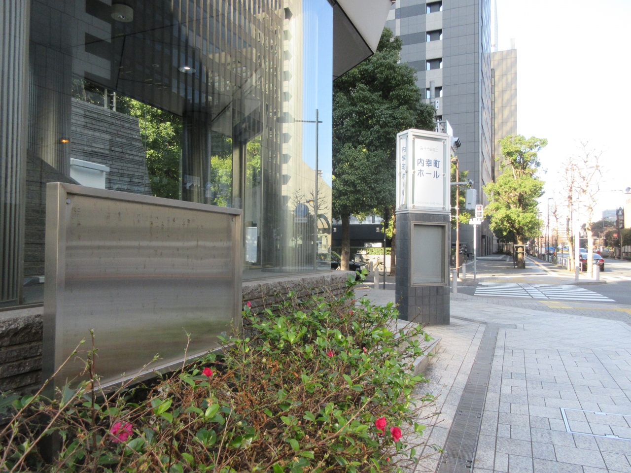 内幸町駅から4分ほどの内幸町ホール入口のツバキの植え込みの中に金属の説明板が立っています。残念ながら文字がかすれて読めませんでした。後で千代田区観光協会のホームページで調べると樋口一葉の生誕の地であることや生涯についての解説が記されていたようです。樋口一葉が暮らしていた本郷を訪ねたこともあり関心ありましたが、ほとんど読めない説明板にがっかりしました。説明板の立替えを望みます。