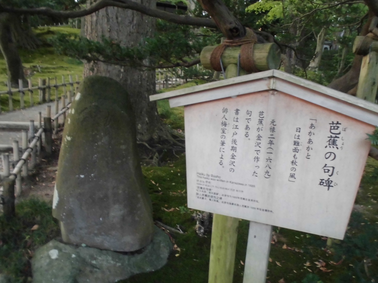 兼六園の北部、山崎山という山にありました。やはり芭蕉は大物なので兼六園のような大きい庭園にもちゃんと句碑ができるんだと感心しました。ただし、石碑自体がだいぶ古くなっているので彫ってある文字はよくわかりませんでした。看板を参考にしてください。