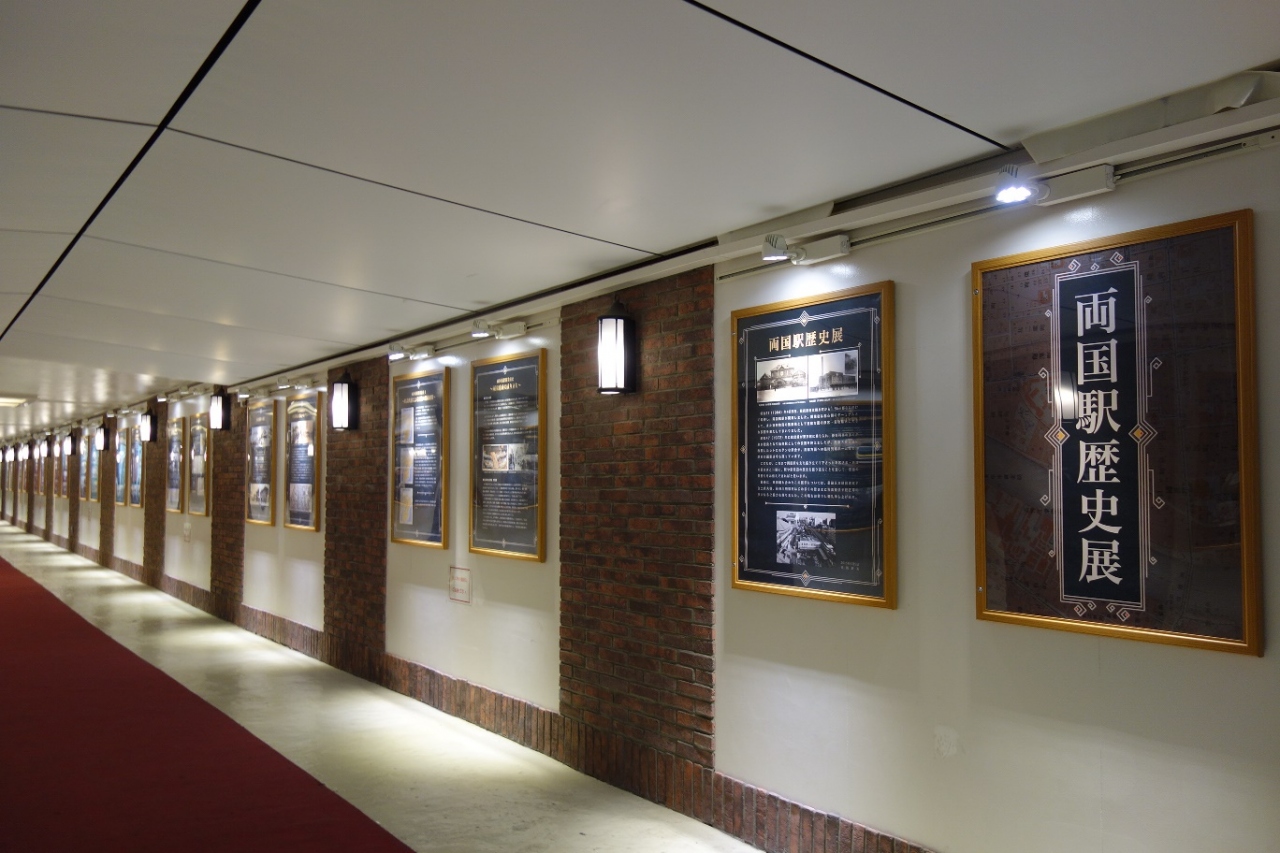 JR両国駅の改札口に近い場所にあるギャラリーです。かつては3番線ホームへ向かう通路だったようで、赤い絨毯が敷かれた廊下に沿った壁に作品が掛けられていました。訪れた日には両国駅歴史展が開催されていました。