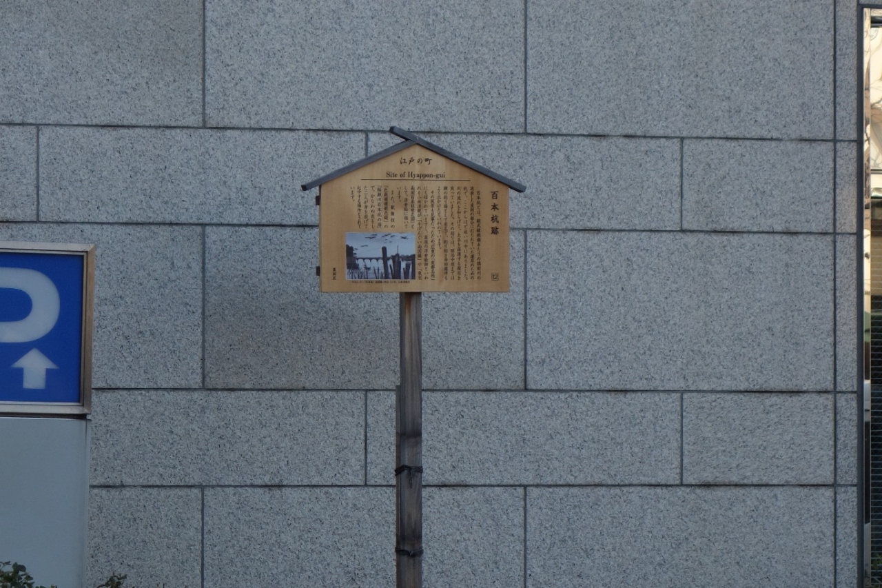 JR両国駅を出て国技館通りを渡った向かいのビルの外壁近くに百本杭のことを説明する札が立てられていました。隅田川の川岸が侵食されるのを防ぐために百本の杭が打ち込まれたというものでした。護岸工事の進歩で現在では杭は見られませんが歴史を知る良い機会となりました。
