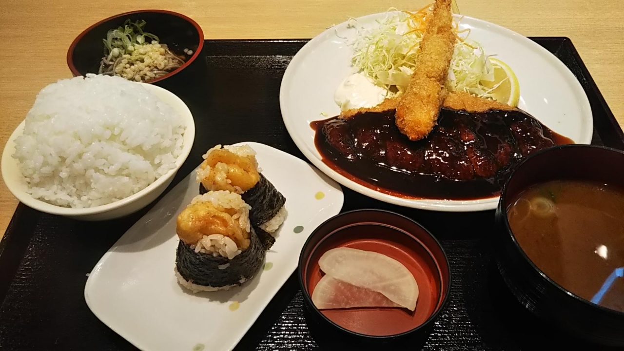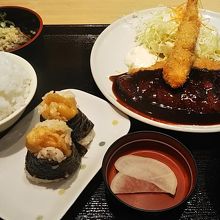 久しぶりの名古屋出張だったのでせっかくのお昼に名古屋名物を食べたいと思い来ました。1時過ぎていたので空いていましたね。頼んだサービスセットは、みそカツ、エビフライ、天むすがついていて名古屋を満喫できました。