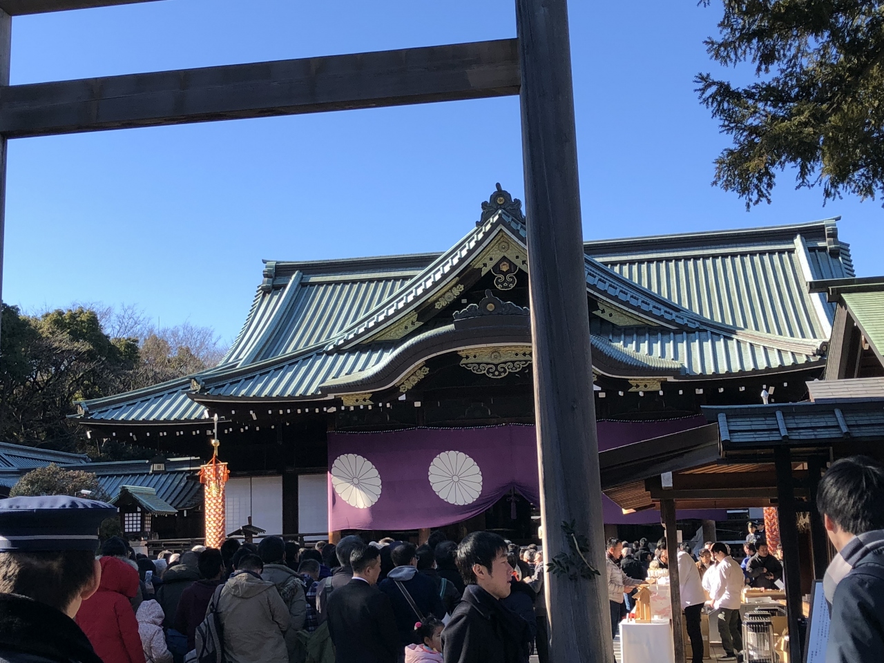 中門鳥居です。ここをくぐると拝殿です。お正月の皇居一般参賀お出まし一回目の流れで行くと、参拝客はこの中門鳥居辺りから並んでいます。ここからだと拝殿におまいりできるまで20分待ちくらいです。