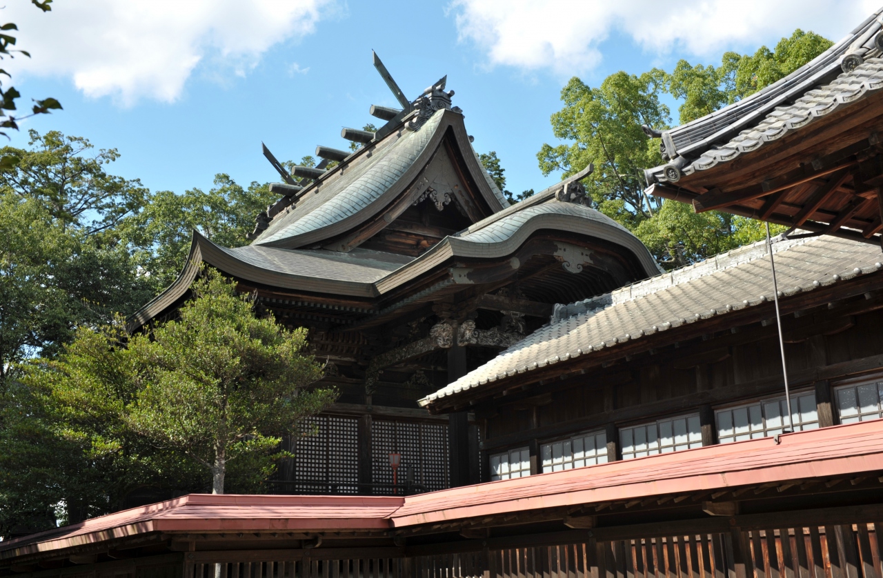 この地を治めることになった森氏が津山城を普請する際、鶴山の山頂にあった鶴山八幡宮を城の西北にあたる現在の地に移したという。津山中学・高校の近くで、旧制高校の写真を撮影したのちに足を踏み入れた。現地は閑静な住宅街だ。本殿はやはり中山造で、堂々とした威風が漂う。別名八子の八幡宮と呼ばれているが、この地が八子と呼ばれているからだという。