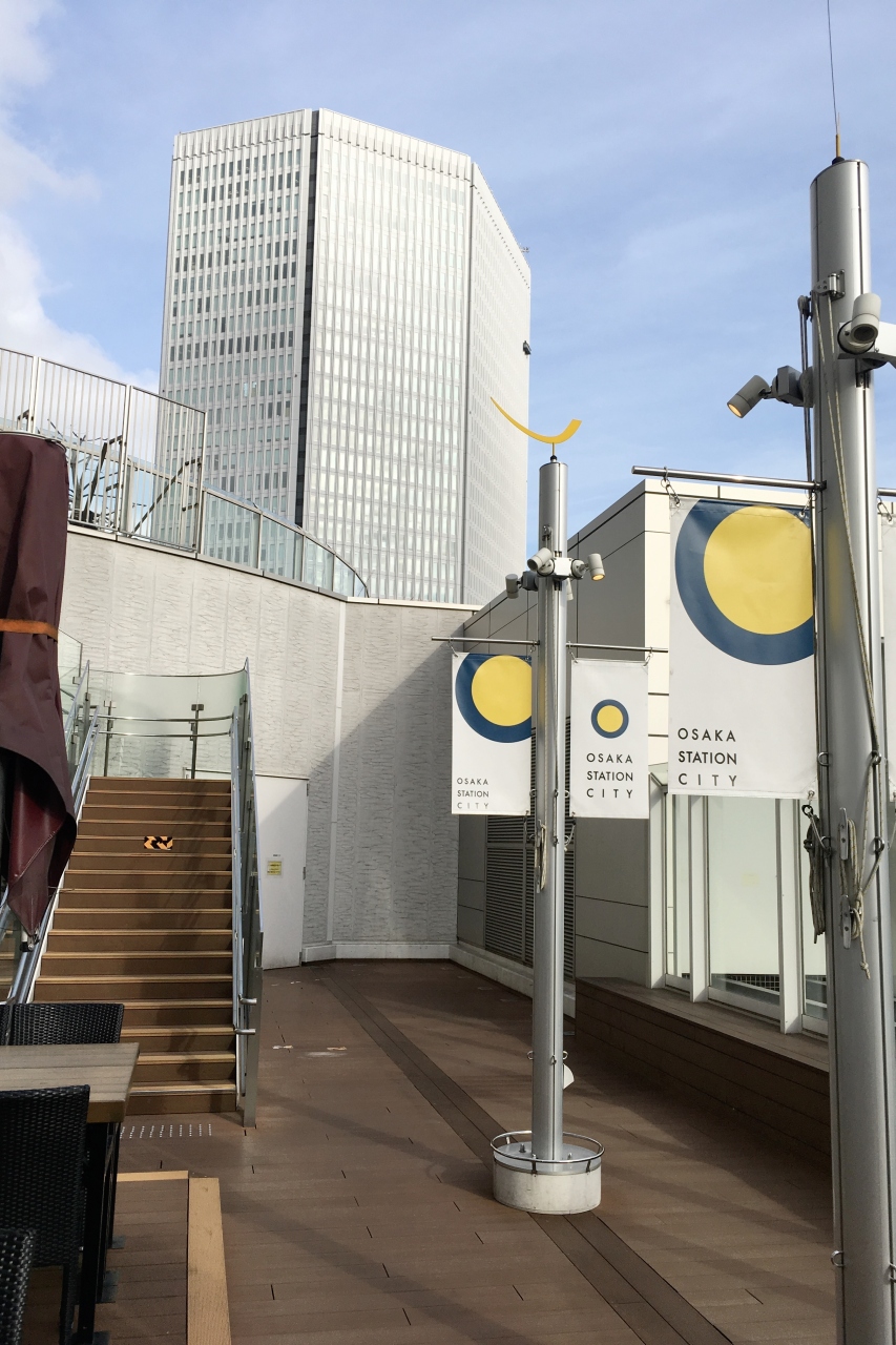 JR大阪駅ビルの大阪ステーションシティに大丸があるのですが、ここのセール会場の横にあるのが太陽の広場。以前はカフェがオープンしていたのですが、いまは閉鎖されています。ただ、このカフェが使っていた机や椅子はそのままになっていていい休憩所になっています。いまは寒いのが欠点ですね…景色などは屋上だけに非常によいですよ。
