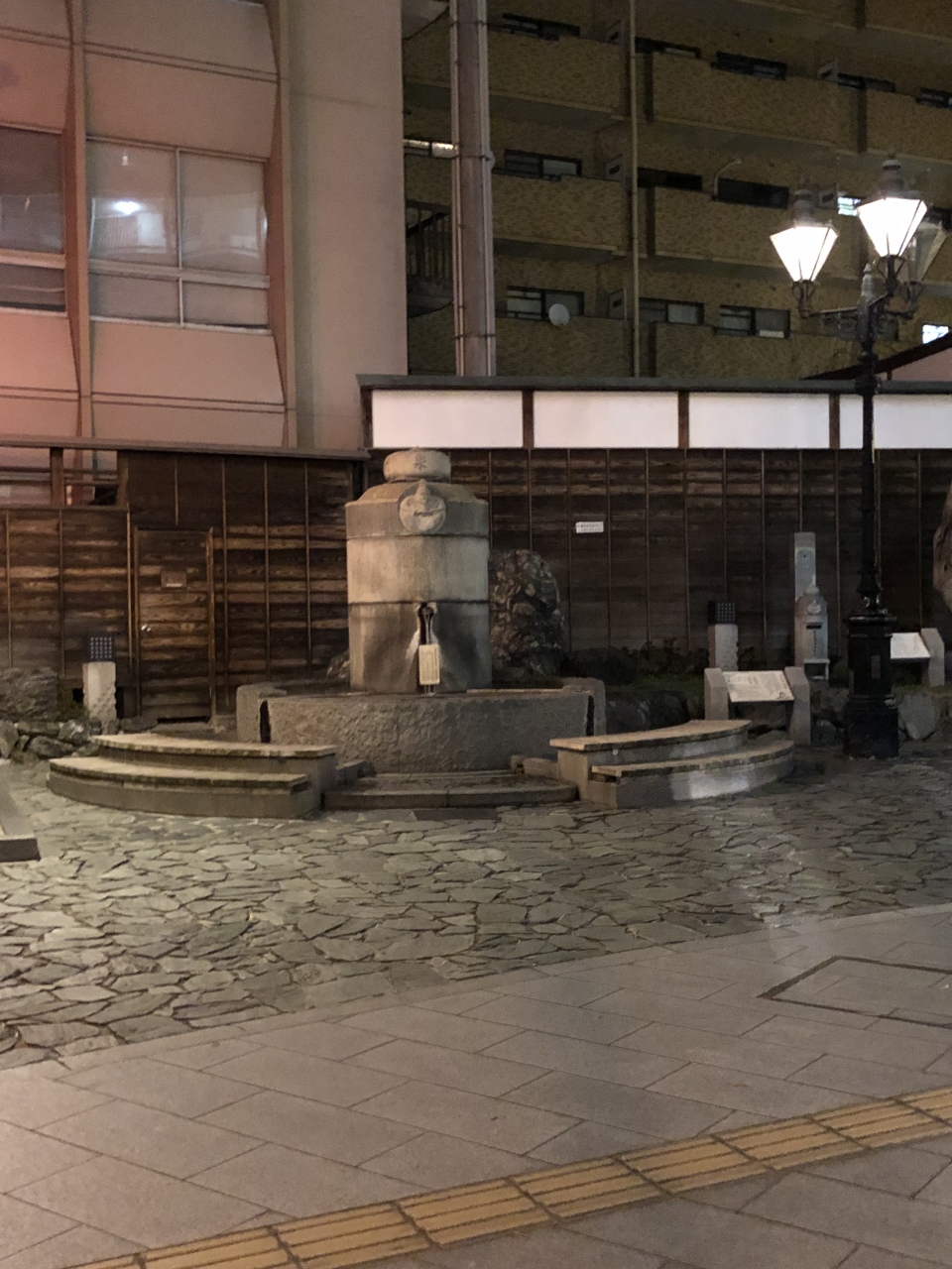 道後温泉駅前のからくり時計の横にあります。真ん中に湯釜があるのが道後温泉らしてくていい感じ。夜でしたが、浴衣姿の何人かが足湯を楽しんでいました。道後は各ホテル・旅館に雪駄が用意してあって、街歩きを楽しめるようになっているので、気軽に散歩の途中に立ち寄れるのもいいですね。