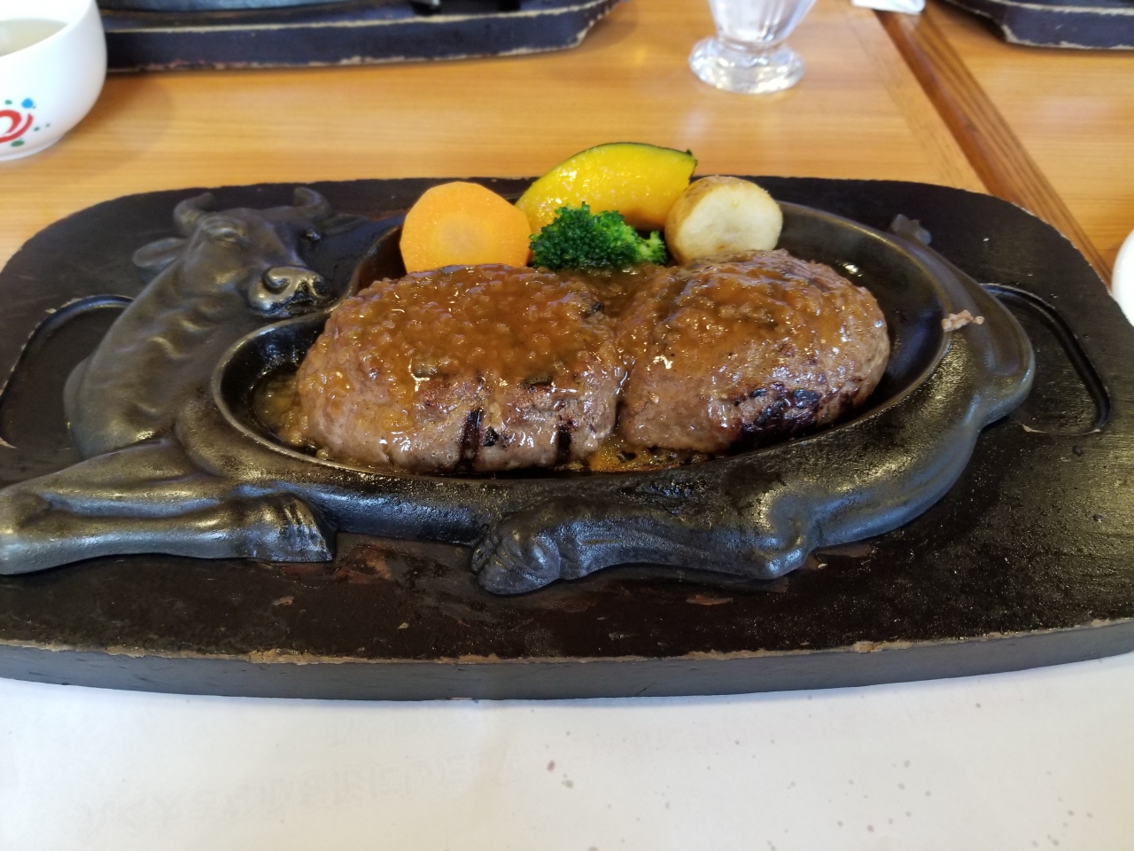 ハンバーグは外側だけ焼いて内側は手元に持ってきてから鉄板で焼きます。