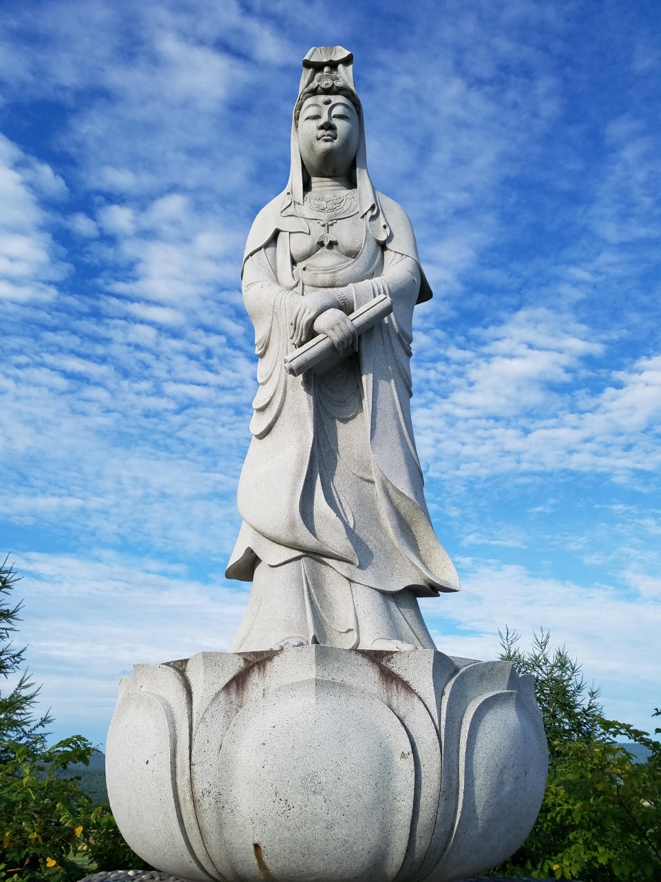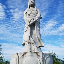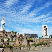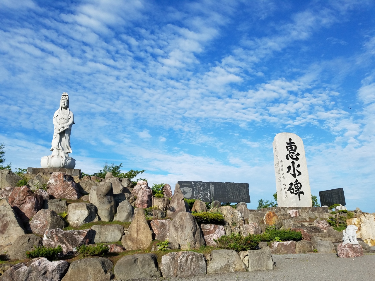 和寒町の三笠山自然公園の裏手の道を上った頂上付近に、恵水観音像と恵水碑があります。天塩川の治水の歴史と苦労をたたえるためにつくられたそうです。巨大像はやさしく力強い表情で存在感があります。たいへん見晴らしがよく、和寒の市街地と道北のなだらかな山々の景色を堪能しました。