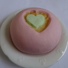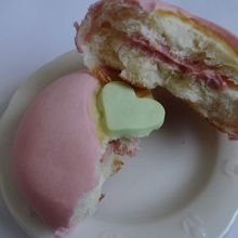 イチゴ?メロン?どっちなんでしょう?完全に苺でした。パンにコーティングされている赤いものはイチゴ、中にはイチゴクリームが入っていました。