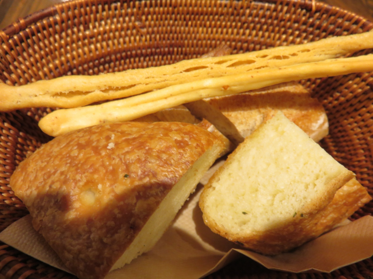 まずはパンが運ばれ、グッシーニ、ローズマリー風味のフォカッチャ、バゲットの3種類