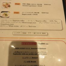 6種類の前菜の盛り合わせ、生ウニのクリームソースタリアテッレ、ミニデザート、パン3種、ドリンクになっています