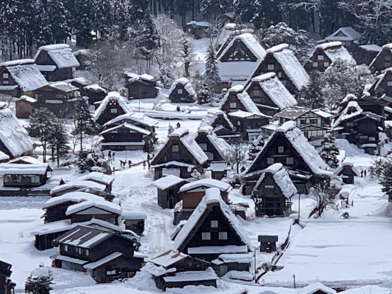 冬の積雪期に訪問。展望台までは車、徒歩、シャトルバスで行けます。茅葺き屋根の集落が一望でき絶景です。駐車場は多少あるので車でも行けます。シャトルバスも並んでいる人が少なければ便利。徒歩は坂道がアイスバーンでかなり滑るのでスパイクが無ければやめたほうがいいです。