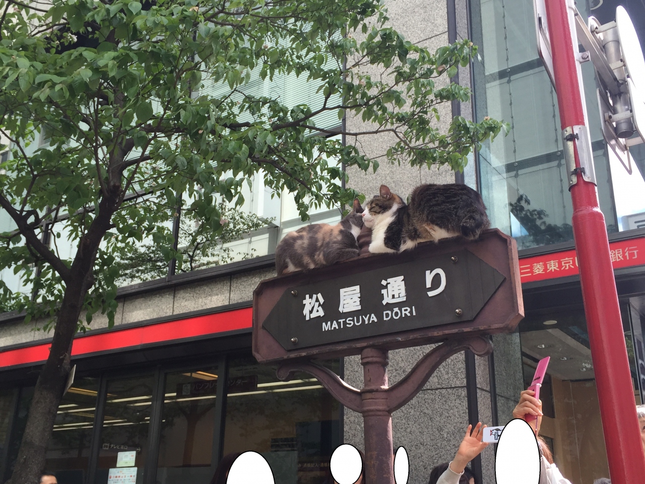 銀座の街並みが凝縮している松屋通り。今回、銀座SIXを出て松屋通りの看板を目にすると、標識の上に2匹の猫が寝ている。すごい偶然。道ゆく人の多くが猫と松屋通りの標識を写真に撮っていました。ブラブラしていると、偶然良いものが見られるから嬉しい。