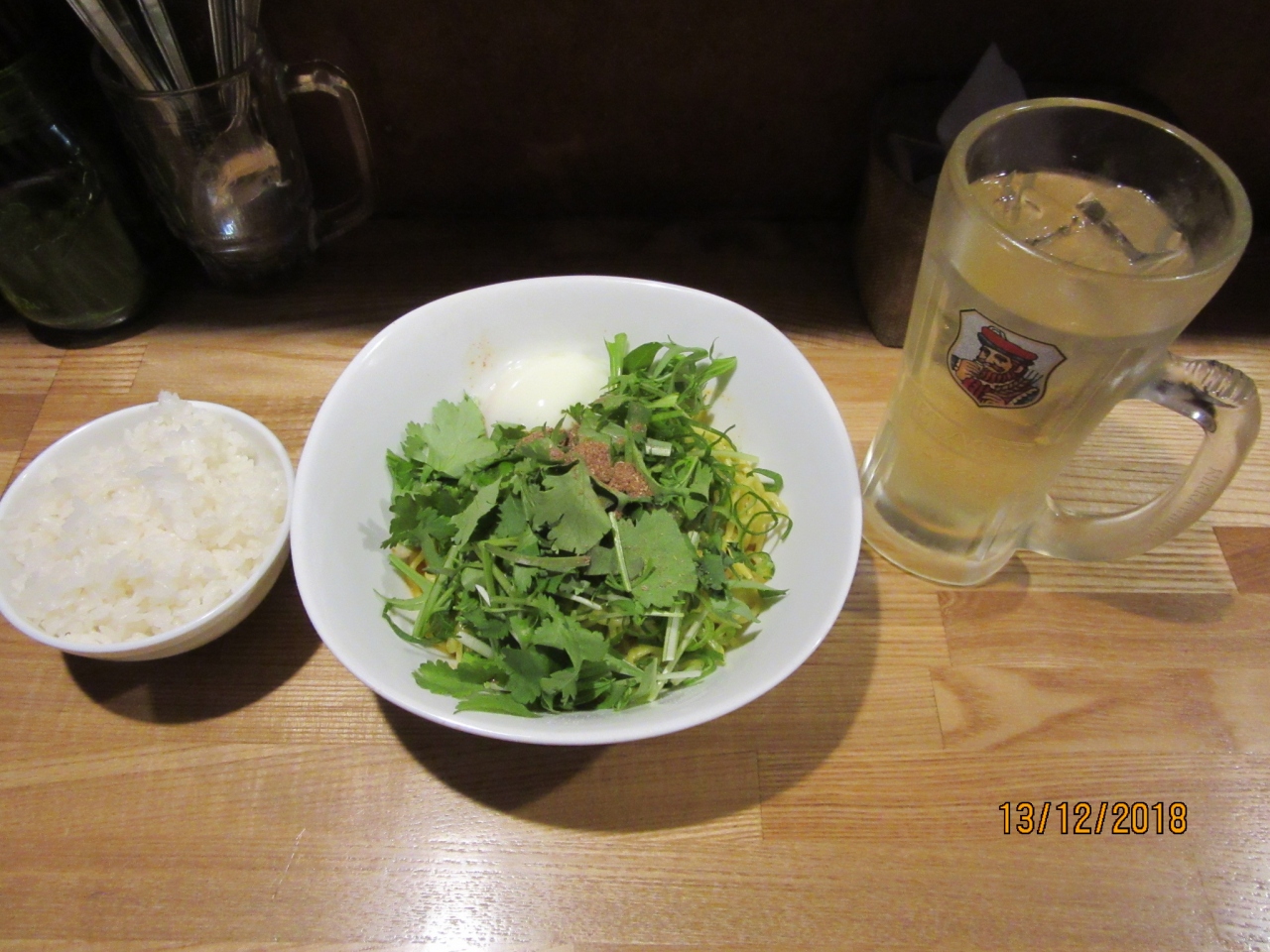 市電袋町下車歩2分、カウンター席のみの小さな店で食券を購入する。汁なし担々麺、ライス、温玉セット650円、パクチートッピング100円、ハイボール400円で合計