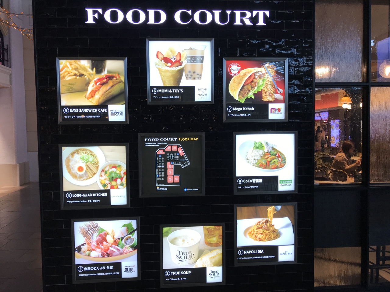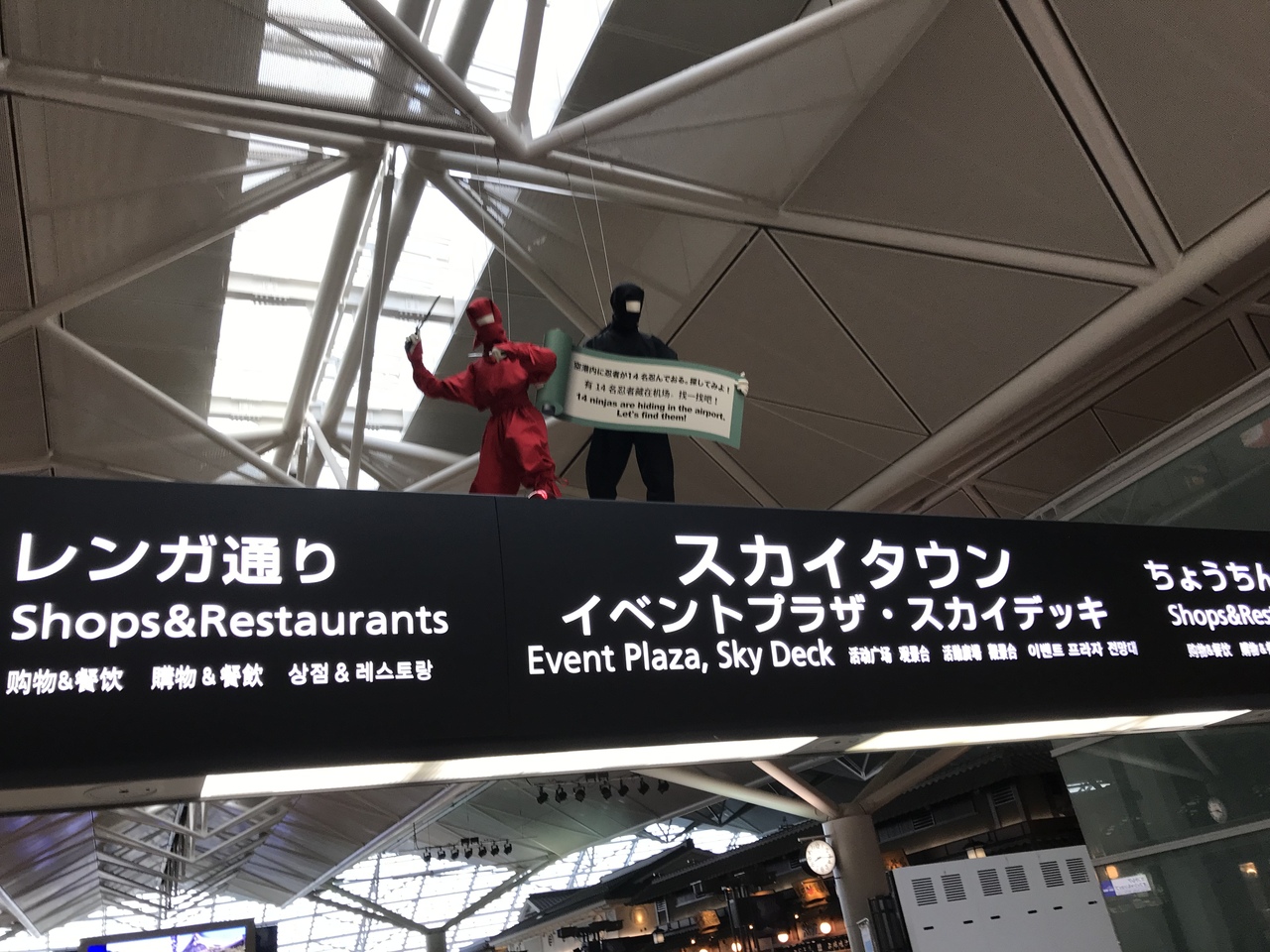 空港に到着すると忍者の人形が迎えてくれます。空港内に14人忍んでいるそう。若鯱家のカレーうどんなど朝から名古屋飯を食べることもできます。またフードコートなのに窓際の席から飛行機が見えるのはちょっとお得です。