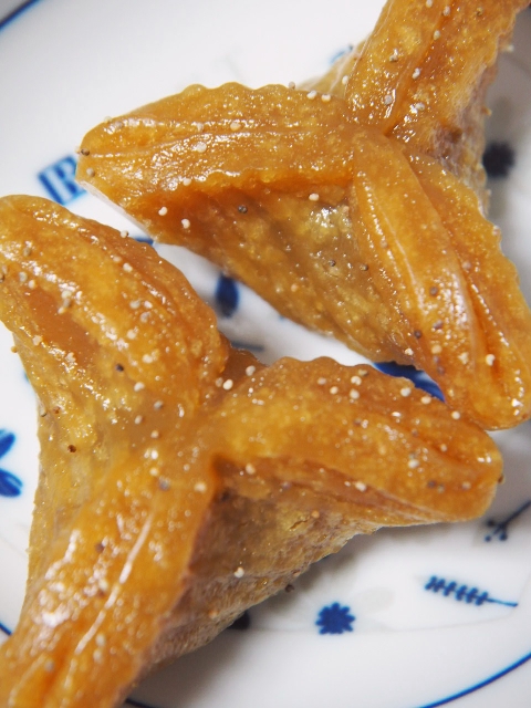 ゆべしというと、もっちりとした、四角の餅菓子が一般的だが(少なくとも、自分がこれまで食べてきたのはそうだった)、こちらは平べったい餅っぽい生地に、餡を乗せ菱形に折っている。パッと見、忍者が追っ手から逃れる為に巻いた撒菱の様。