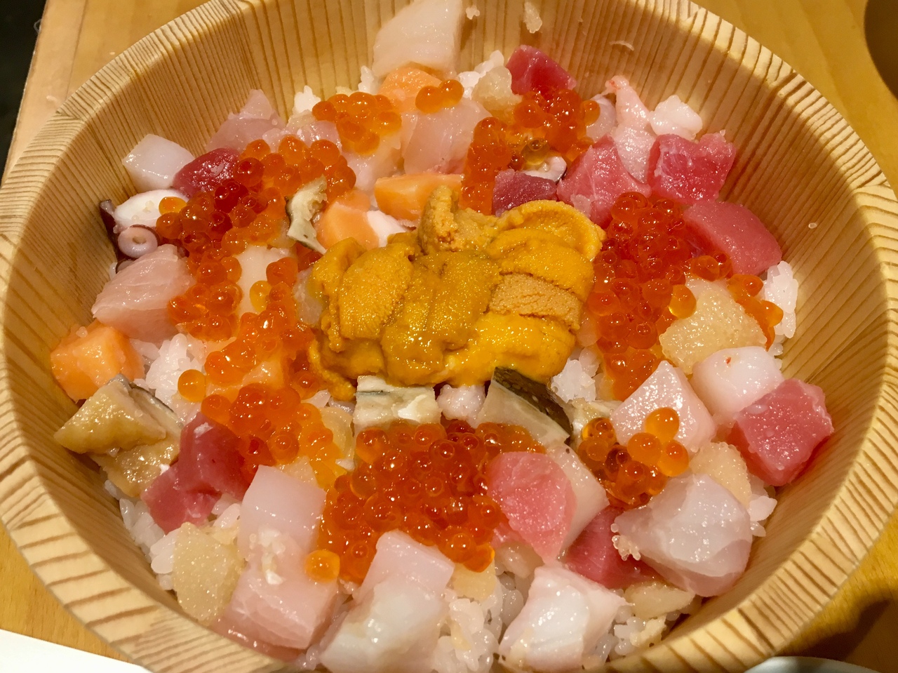 築地市場場外に数店舗ある虎杖が営む丼に特化している店。名物の海鮮ひつまぶしも手軽に食べられるのが魅力。平日の昼間には、小さな店内に外国人観光客や修学旅行生の姿も多いものの、回転も早いのであまり待たずに食べられる。