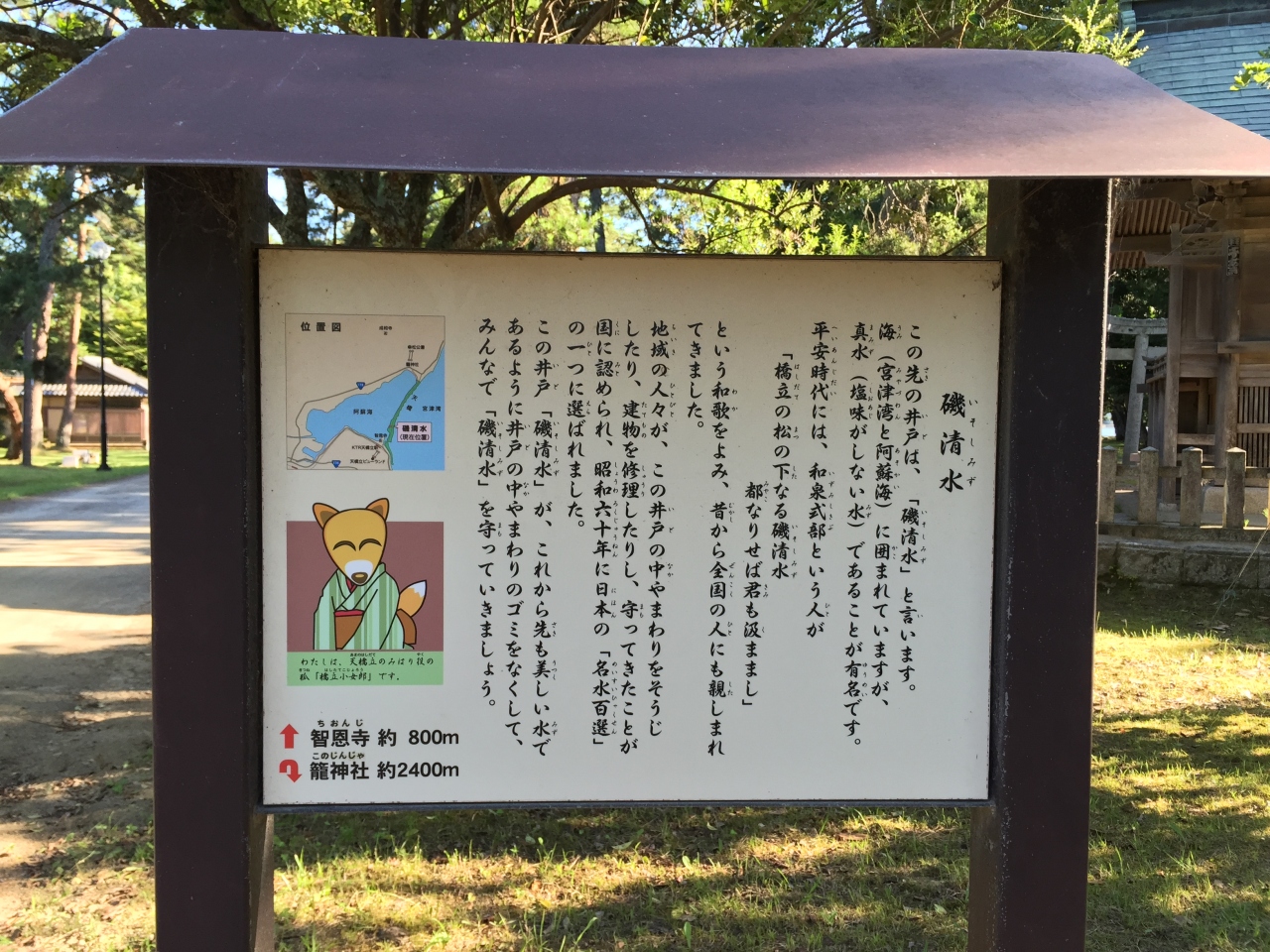 天橋立をどれくらいあるったのか、20分くらい?天橋立神社に到着しました。小さなお社で、雰囲気があります。すぐ近くには日本100名泉の磯清水がありました。別名、磯清水神社ともいうらしい。神社の御由緒を見てみると、もともとは八大竜王を祀っていたとか。恋愛成就に効くということ。