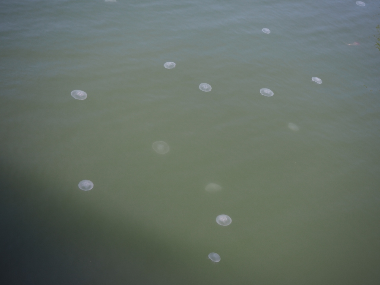 天橋立を渡る前に廻旋橋を渡ります。船のためにグルリと橋が廻旋するようになっていて、面白い。橋を渡っている最中、川の方をながめると、ぷかぷかと大量のクラゲが浮かんでいるのを発見。まだ6月、海開きもまだだろうに、このあたりは初夏からクラゲがでるものなのかな?