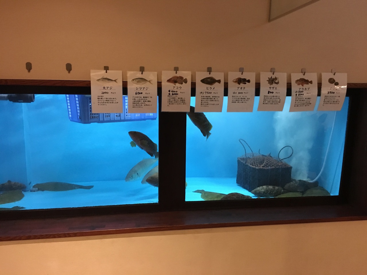 店内には生簀もあって新鮮な魚介類が食べられる。カウンターもあるので一人でもどうぞ。