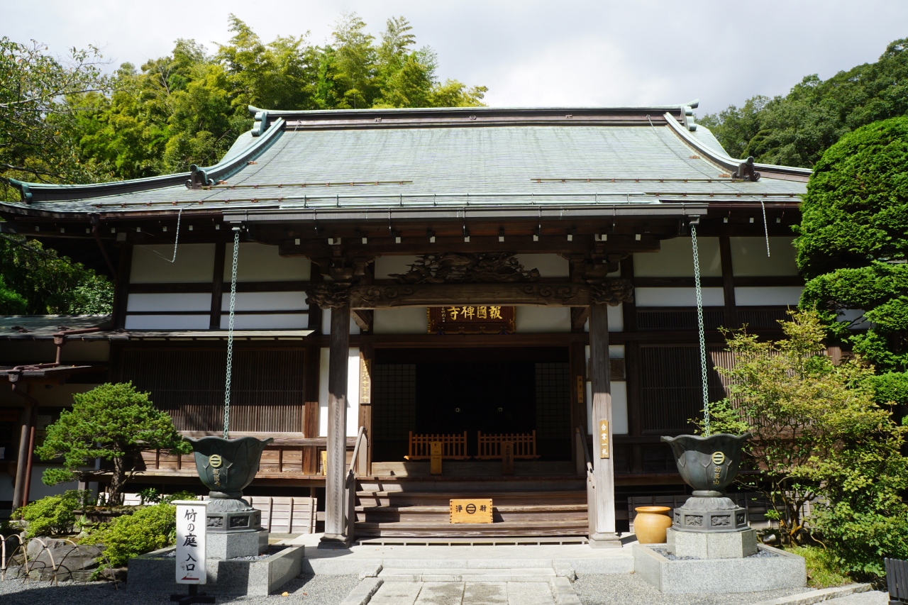 報国寺の本堂は、山門から続く参道を進んで石段を上がった正面。南北朝時代、宅間法眼作と伝わる本尊、釈迦如来坐像が安置されています。正面には繊細な龍の彫刻が見えますが、小さいのであまり見応えはないかも。やっぱり、裏の竹林に面した庭と一緒に見る眺めの方が美しいと思います。