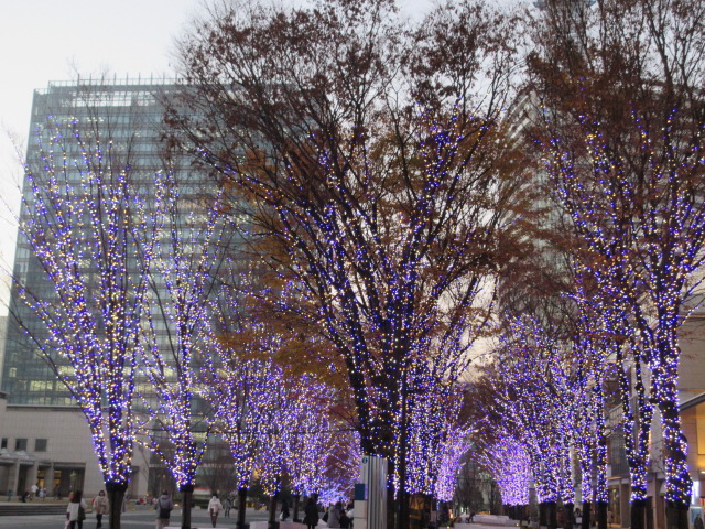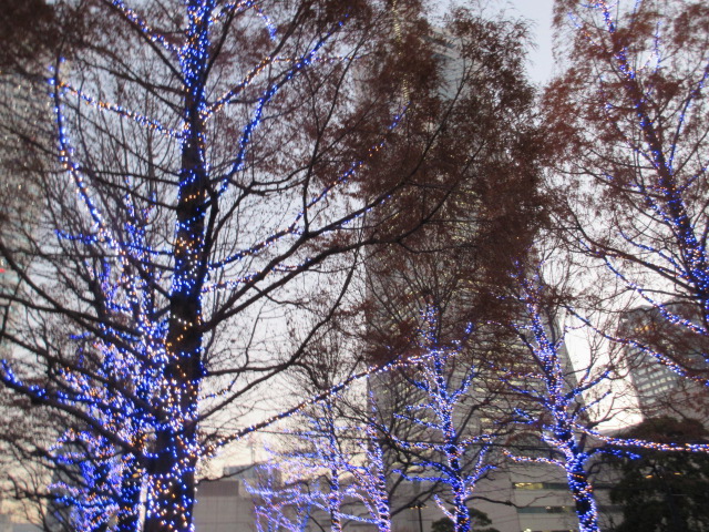 横浜のみなとみらいにあるスペースです。ドックヤードあたりから連なる「グランモール公園」という場所の一部で横浜美術館の前あたりです。ここは水もあるし花もあり、ベンチなどもあってきれいな場所。ケヤキの木々が並んでいて、冬なのでイルミが青で統一されてて