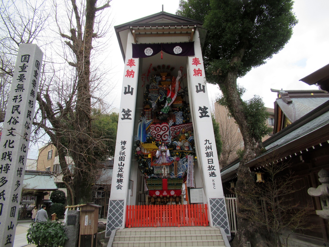 古代からの港湾都市で、中世に日本初の自治都市となった博多、その突端に建てられているのが博多の総鎮守「櫛田神社」、さすが立派な社殿です。博多祇園山笠を執り行う神社だけあって境内には大きな「飾り山笠」、奉納された「力石」、島井宗室屋敷跡から移築再建された「博多塀」など見所がいっぱいです。
