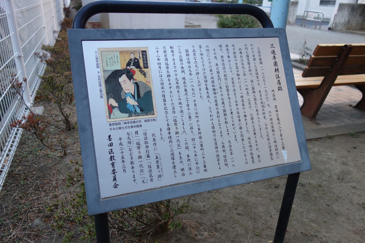 両国エリアを散策中こちらの住居跡へ立ち寄りました。北斎通りの北側に有る亀沢第一児童遊園の敷地の一角にここへ初代三遊亭圓朝の自宅が有ったことを示す看板がありました。説明によると、この人物は江戸時代後期から明治時代にかけて活躍した落語家だと書かれていました。