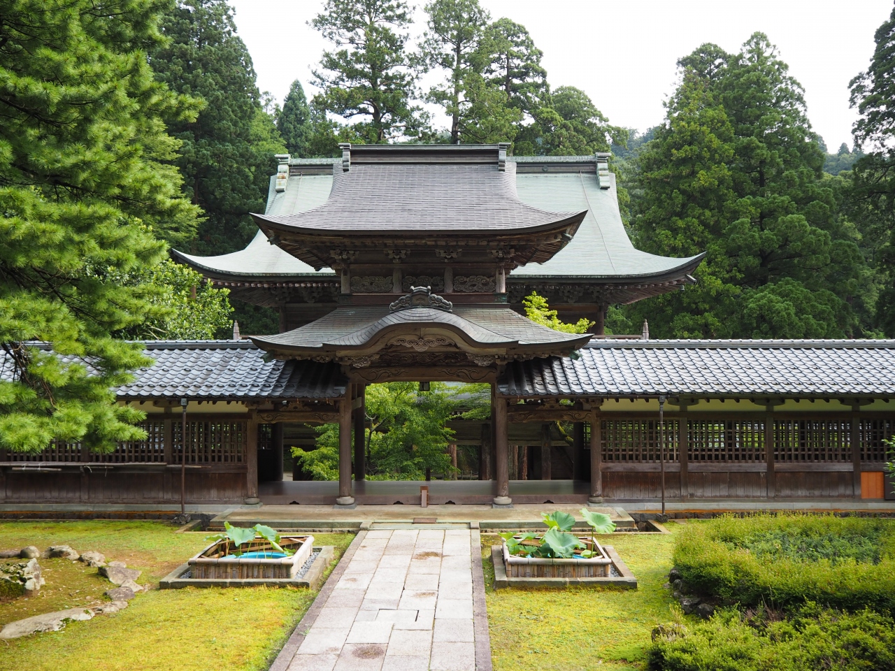 仏殿の正面に中雀門があります。塀と門が一体化していて、風情のある造りになっています。屋根の形や建造物が二重になっているのがとても珍しいと思います。屋根の端っこがゆるやかに上を向いているんですが、雪国でこういう造りもするんですね。この門は見ごたえあります。