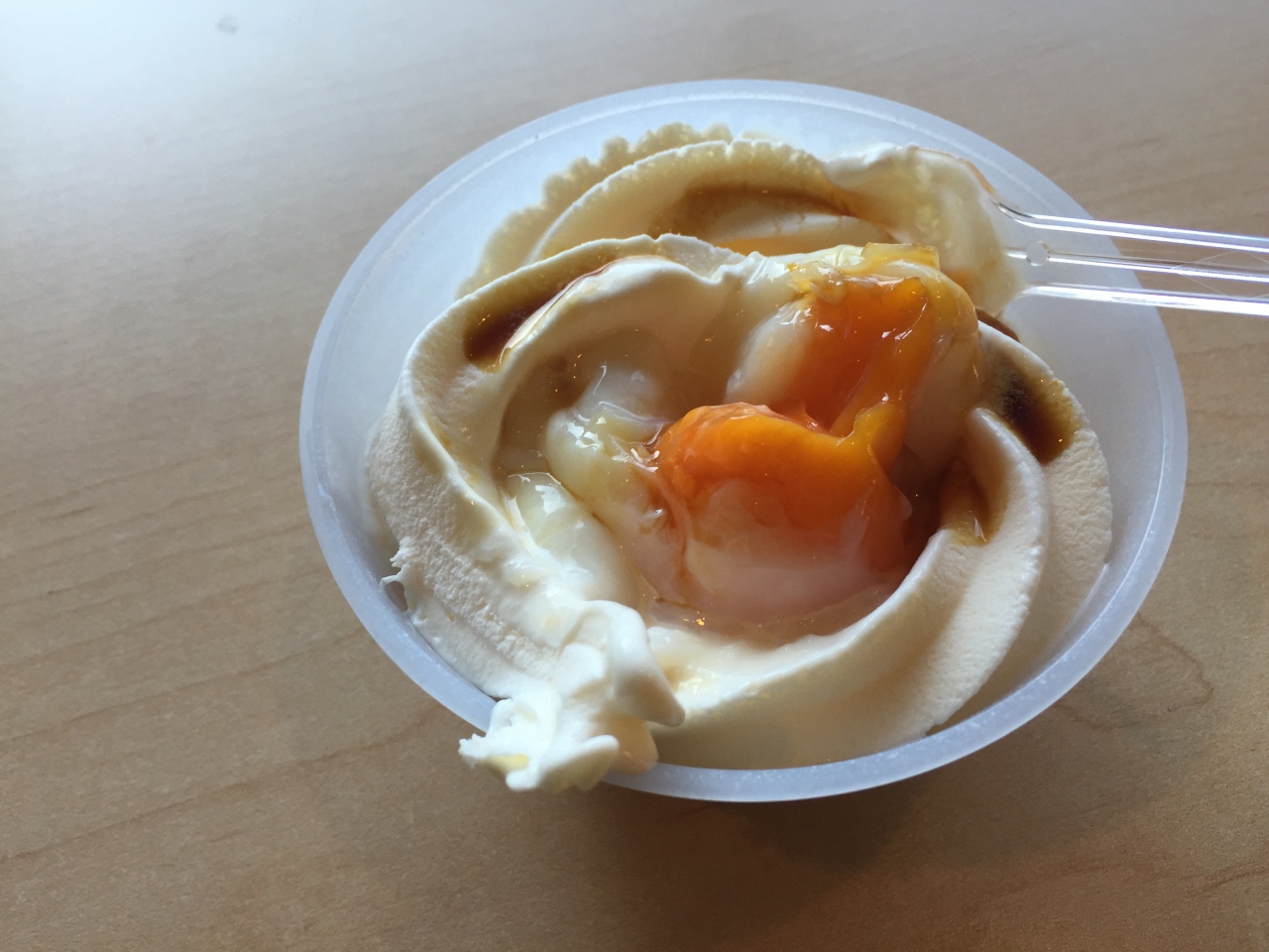 お湯は熱めで、あんまり長く入ってられないので浸かるだけ浸かってすぐに出てしまいました。お風呂は今どきの綺麗めな先頭みたいな感じ。お湯も透明であんまり温泉って感じは島かった。外に出て、温泉卵入りアイスクリームを食べました。温泉卵いらないと思った。