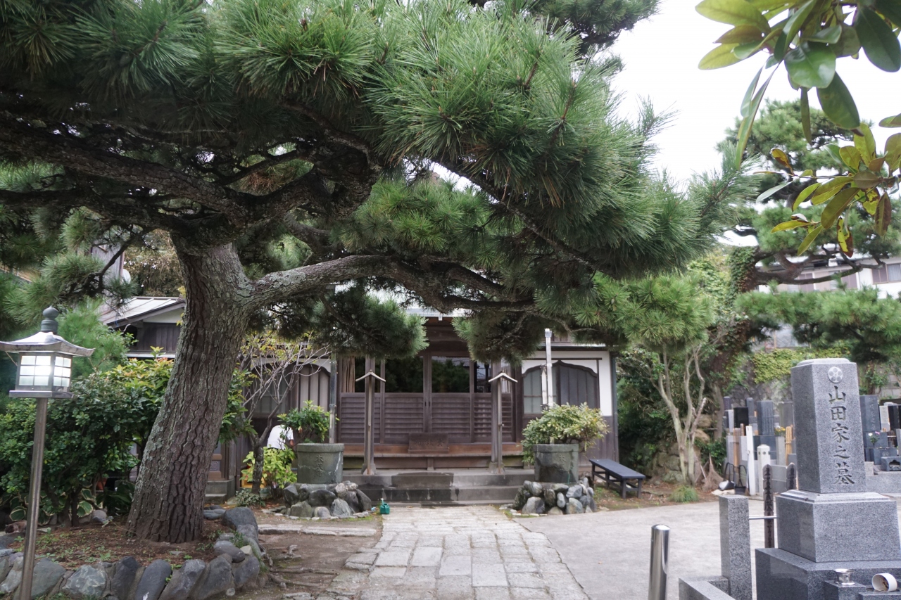 本成寺は、寺が多い腰越地区の一角。山門から本堂に向かう周囲はお墓だらけという感じ。