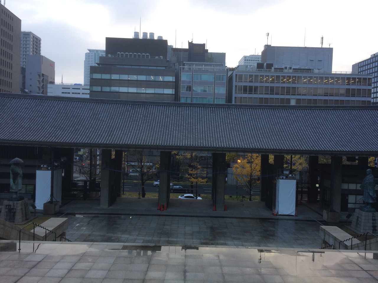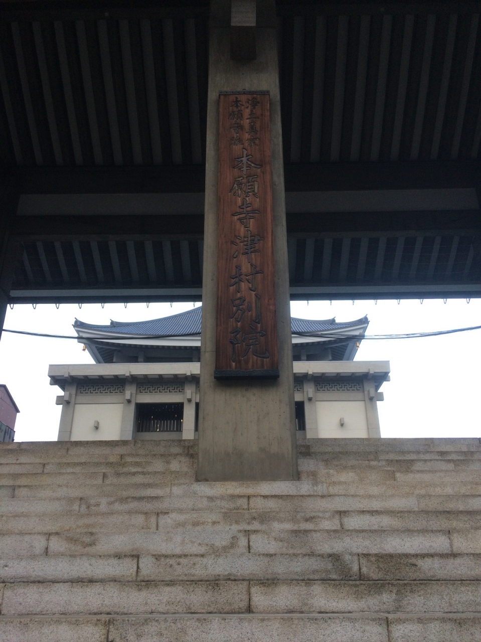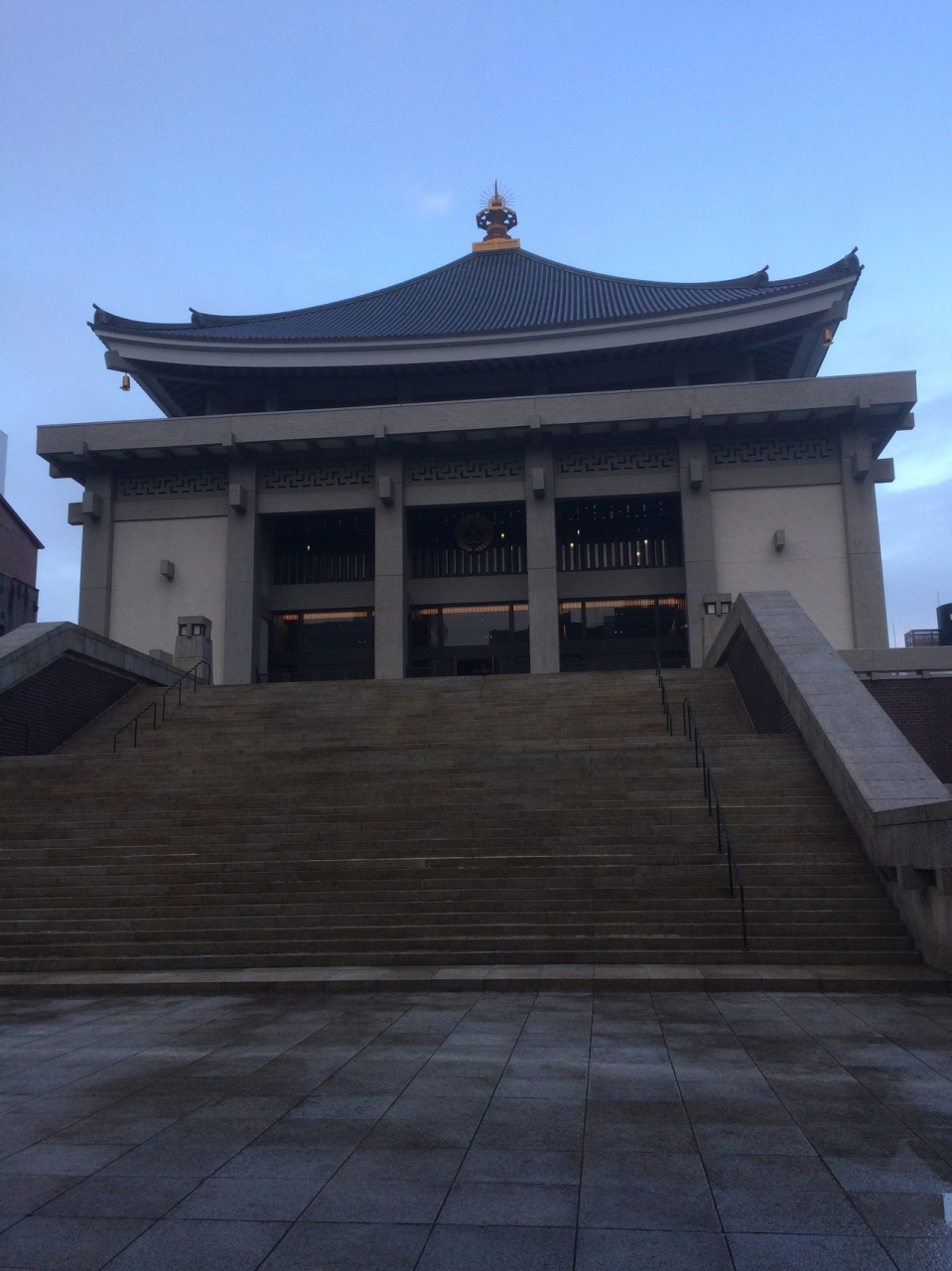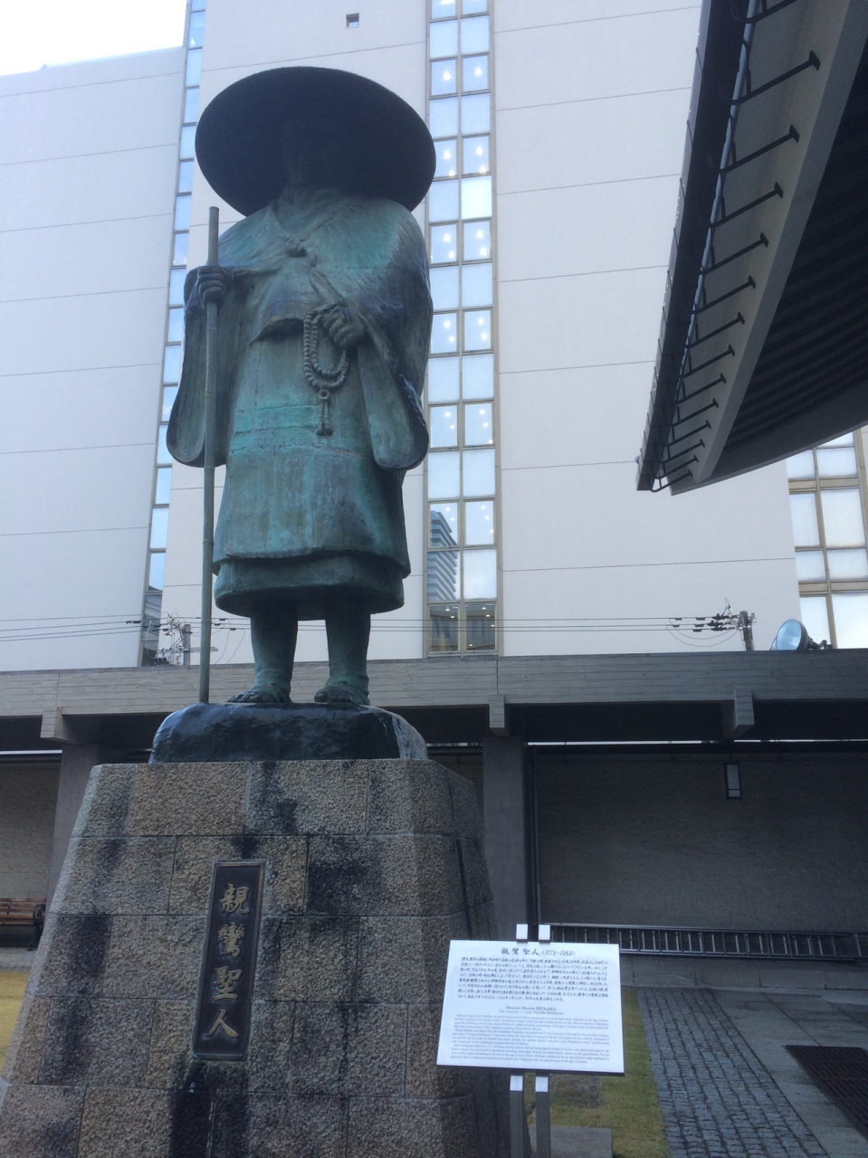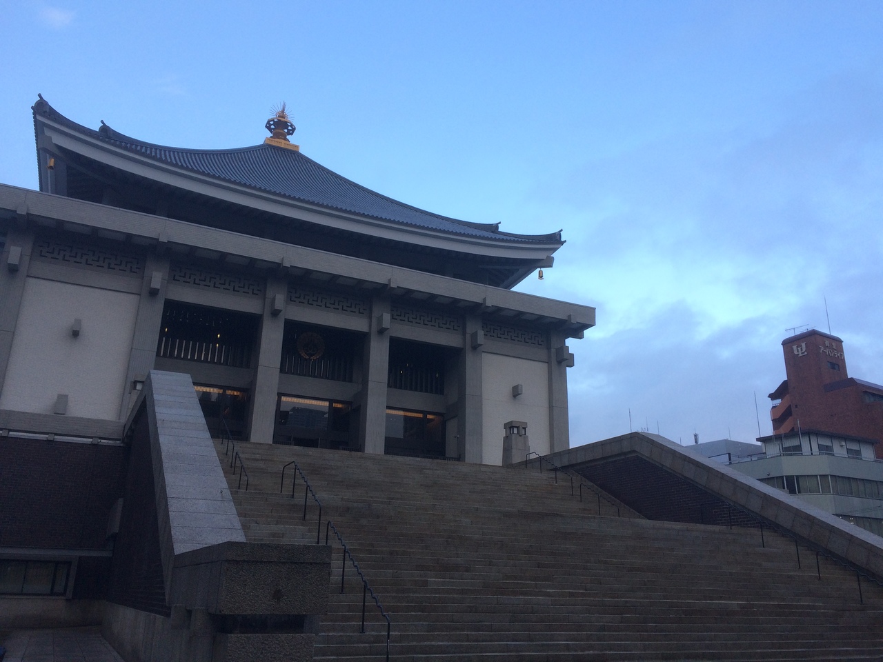 数段の階段を上がると門があり、立派な門でした。門をくぐると左右に蓮如上人と親鸞上人の像があります。正面の本堂には数十段の階段を上がり、頑丈で地震がきても倒れそうもない建物でした。中にも入れたくさんの椅子が置いてあり、お参り出来ます。