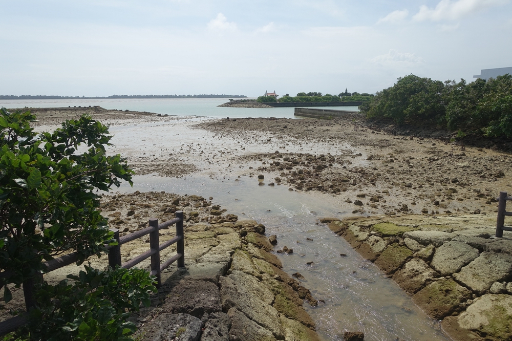 全般的に遠浅な海で、赤名宮に行った時は干潮時だったせいかだいぶ干上がっていました。そのあと行った川満漁港付近も同様でした。満潮時だと少し違った景観かもしれません。それでも干潟といった場所が多く、海水浴に適した砂浜はないように思います。ほかにサニツ浜などでも与那覇湾を近くで見て感じることができます。