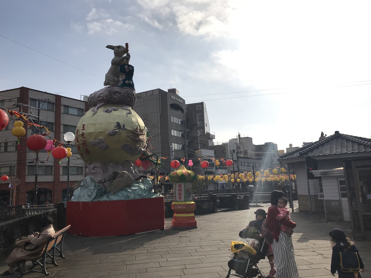 ランタンフェスティバルで行ったら、黄色いランタンと、謎の餅をつくウサギの巨大ランタンが設置されていました。