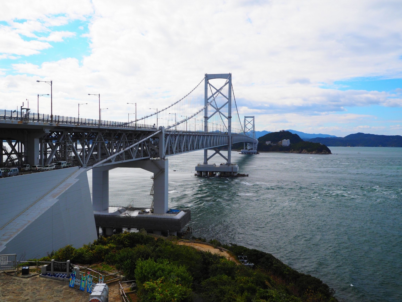 淡路島と四国徳島県を繋ぐ大鳴門橋、渦潮で有名な鳴門海峡を一跨ぎしています。潮の流れが速い海底に橋脚が建っていますが、よくぞこんな急流の中に建てられたものだと感心します。橋の袂の「道の駅うずしお」の展望台から鳴門海峡・大鳴門橋共々良く見られます。
