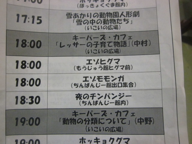 他にも、慣れない手つきで一生懸命作業されている飼育員さんの人形劇(本業じゃないですしね…)や、お布団を敷くチンパンジー(?)の様子など、楽しいことが一杯で、動物園本来の楽しさが凝縮されたイベントで、また行きたいなと思いました。