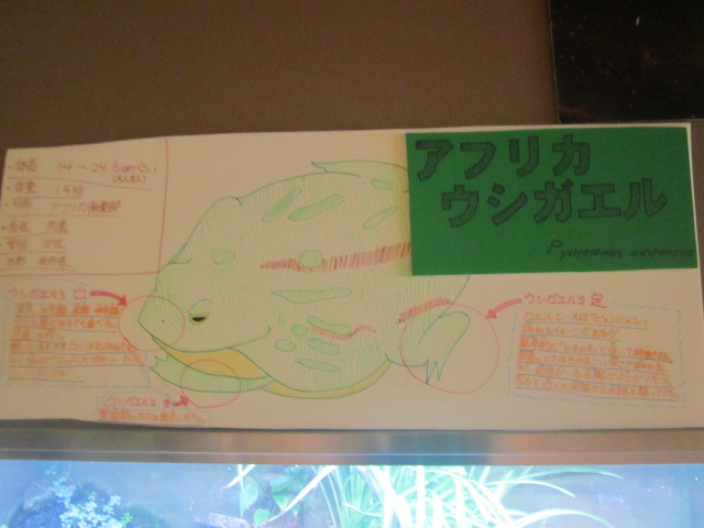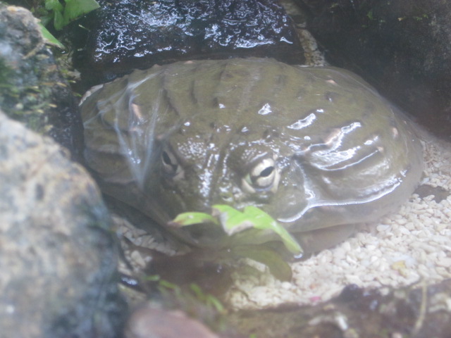 カバさんは数年前に新たにかば館として生まれ変わった現在地に引っ越してきたのですが、その際に、「ゲテモノ水槽」(このネーミング、カエルマニア的にはちょっと切ないけど…)と呼ばれる水槽が新設されて、そこにマダガスカルのゴキブリやイベリアトゲイモリさん等と共にやって来たのが、アフリカウシガエルさんです。