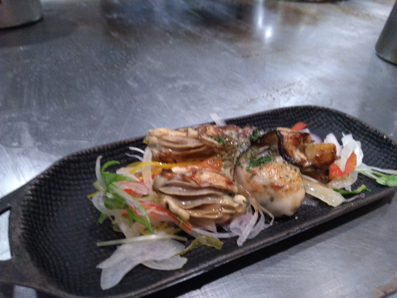 「牡蠣のしょうゆバター焼き」を注文したところ、一人客向けに半分の量にしてくれました。値段もちょうど半分です。お好み焼きも半そばにしてくれました。そちらは70円引きでした。