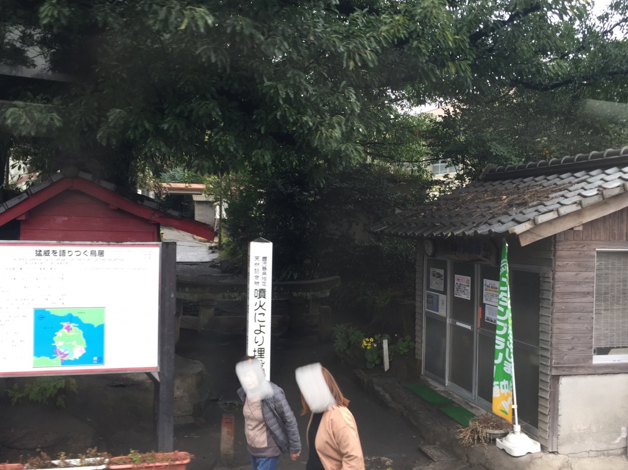 ここ黒神地区にあった「腹五社神社」の鳥居が1914年の大正噴火後、たった1日のうちに火山灰で埋まってしまったそうです。 もともと高さ3mあったという鳥居ですが、現在は約1mを地上に見せています。噴火後も、大噴火のすさまじさを後世に伝え続けていくことで、そのままになっているそうです。
