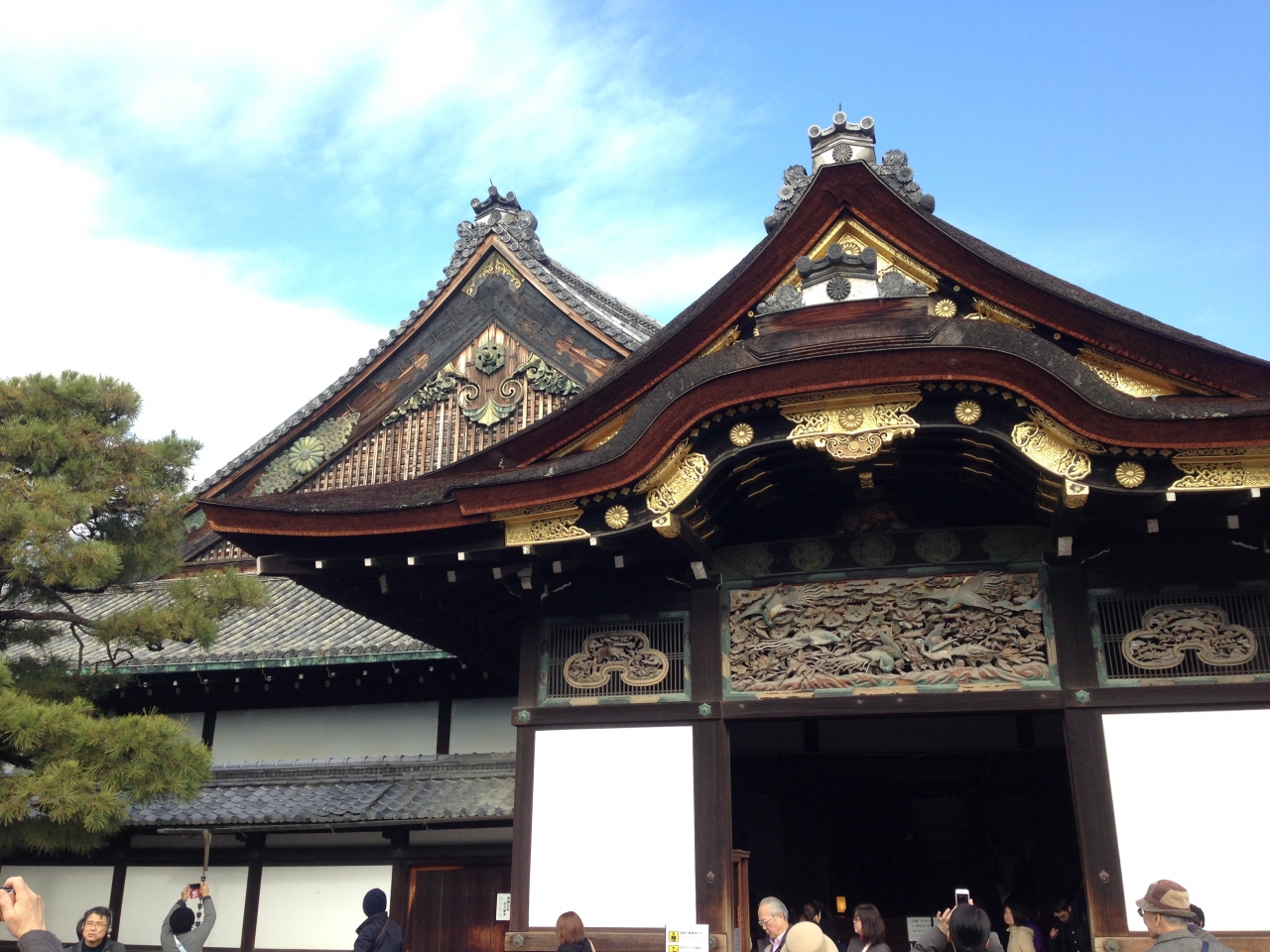 靴を脱いで入ります。大政奉還の部屋には時代風俗衣装を着た人形が展示されていて、その当時の様子がよく分かります。それだけでなく33の部屋には狩野派による障壁画と素晴らしい彫の欄間で装飾されていて時間が経つのを忘れます。ただ内部は撮影禁止です。