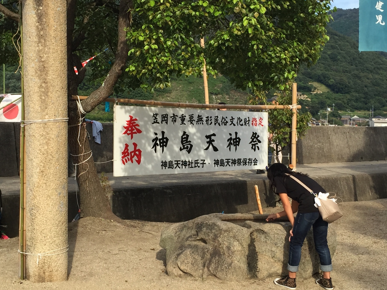 シルバーウィーク期間にうさぎの島へ行こうとたまたま通りかかったら上島天神祭を開催していました。布でできた独特の形をしたおみこしが沢山出ていて、お祭り真っ最中の雰囲気でした。御神輿があっちにいったりこっちにいったりするので、砂埃がすごかった。活気があるお祭りです。