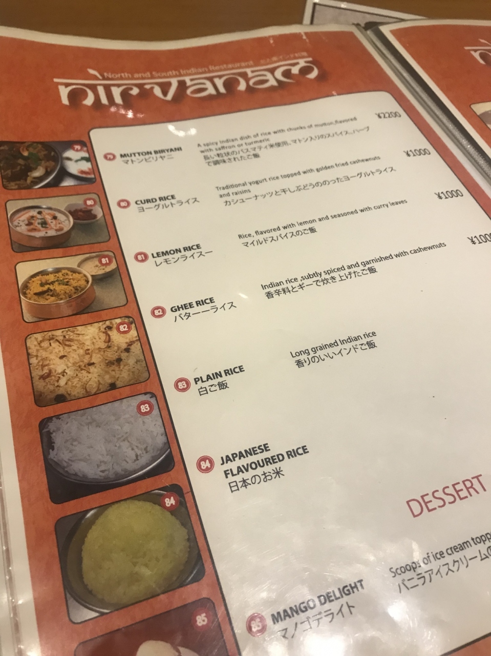 有明のTOCビル3階にあるインド料理のレストランです。北インド、南インド両方の料理があります。かなりメニュー豊富で、スープ系もあります。ちょっと値段は高めです。ビラヤニもあるし、デザートも七種くらいありました。本格的な味です。